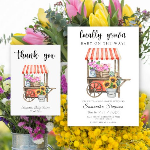 "O bebê crescido localmente está a caminho". Celebrar com este chá de fraldas de carrinho de flor de aquarela.
