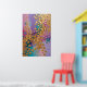 Flores pintadas em ouro sobre fundo de rosa, lilás, roxo e turquesa.