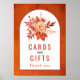 Flores de outono e cartões botânicos de arco de laranja queimados e presentes poster de casamento. Esta bela design de casamento mostra uma armação em fundo vermelho laranja queimado. No quadro há o texto e um buquê de flores dalia e folhas em cores de outono.