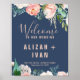 Esta poster de casamento romântica com flores azuis é perfeita para um casamento elegante. O design floral apresenta flores brancas, cor-de-rosa-claro, cor de pêssego e branco em cascata, em um fundo azul-marinho. Personalize o poster com o nome da noiva e do noivo, e a data e o local do casamento.