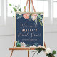 Este romântico de peônias floresce poster de boas-vindas chá de panela azul é perfeito para um chá de casamento elegante. O design floral apresenta flores brancas, cor-de-rosa-claro, cor de pêssego e branco em cascata, em um fundo azul-marinho. Personalize o poster com o nome da noiva a ser, e a data e o local do chá de panela.