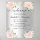 Um programa de boas-vindas, poster de cronograma para um casamento. Um fundo de aspecto prateado, a na moda, decorado com flores rosas e brancas. Personalize e adicione seus nomes e detalhes. Letras negras.