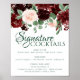 Guirlanda floral sofisticada em aquarela "Signature Cocktails" cardápio de bebidas recepção, festa ou sinalização de chá de bebê com cabeçalho pintado à mão em marsala burgundy vermelho e rosa beijo com flores de acento azul-marinho realçadas por louro botânico e vermelho escuro. Da coleção "Boho Bloom", este layout incorpora flores selvagens ricas boêmias com florações radiantes e folhagem verde de eucalipto. Para outras cores ou produtos correspondentes, visite a loja JustFharryn Zazzle ou entre em contato com o designer, c/o Fharryn@yahoo.com Todos os direitos reservados. #bohochic #zazzlemade