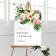 Bem-vindos convidados para o seu evento com este personalizável sinal de boas-vindas. Apresenta ilustrações de aquarela de verde tropical e flores como hibisco e plumeria. Personalize adicionando seus detalhes. Esta placa de casamento tropical é perfeita para casamentos de verão.