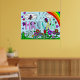 Um grande poster colorido para o quarto de uma criança com o nome Hannah. Flores coloridas, púrpura, rosa, vermelha, amarela, azul e verde, com um arco-íris bonito, borboletas, lagartas e preguiças.