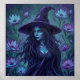 Bruxa enigmática com chapéu de abas largas entre flores roxas brilhantes, paleta azul-roxa etérea, cabelos escuros fluindo e olhar místico.