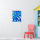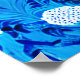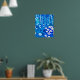 Cartaz em ilustração semi-abstrata de uma floresta fantasia com flores, folhagens, árvores e pássaros, em tons de azul cobalto e branco