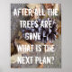 Depois de todas as árvores terem desaparecido - qual é o próximo plano? diz este poster de conservação florestal sobre mudanças climáticas, aquecimento global, esforços do dia da Terra e práticas comerciais ecológicas. Este poster é um lembrete excelente do que está em jogo, à medida que enfrentamos a extinção de espécies e seus habitats de vida selvagem, usamos árvores sem considerar as centenas de anos de crescimento que foram necessários para tê-las, e à medida que apoiamos práticas comerciais mais sustentáveis. animais de conservação da natureza da poster de vida selvagem - CricketDiane Designer/Artist 2017 e Cricket House Studios Art e Design (20 14 design