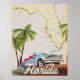 Belo mapa ilustrado do estado da Flórida e das ilhas da região em um belo estilo de vintage com um carro retrô dos anos 50.