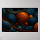 Um trabalho de arte digital mesmerizante com esferas azul e laranja brilhantes enfiadas entre estruturas giratórias e semelhantes a fita. A composição evoca um universo fantástico ou um mundo microscópico, rico em textura e profundidade. Perfeito para amantes da abstrato, temas cósmicos e narrativa visual vibrante.