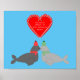 Esta poster apresenta um beijo de focas românticas. Um deles é cinza clara e o outro é cinza escura. A cinza clara está vestindo um lenço verde e um chapéu, e a sela cinza escura está vestindo um lenço vermelho e um chapéu. Acima das focas está um par de canas doces vermelhas e brancas em forma de coração, cercando um coração vermelho com dentro de texto branco que diz "Seladas com um beijo de Natal. Uma design para o Natal e para os casais passarem juntos o seu primeiro Natal.