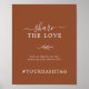 Este aterramento de folha mínima Compartilha o sinal de poster da hashtag do casamento do Amor é perfeito para um casamento elegante. A design apresenta uma simples silhueta verde folha em laranja queimado com estilo minimalista de boêmia do deserto. Personalize a placa com a hashtag de casamento.