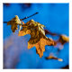 Vista aproximada de uma folha seca de carvalho iluminada pela luz do sol de março. Fundo azul escuro. Mantenha a calma, a primavera está chegando.