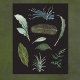 Folhas verdes botânicas e ilustrações da história natural da planta sobre fundo preto.