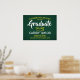 Adicione um toque personalizado a uma comemoração de faculdade ou segundo grau com um poster de 18"x24" personalizado, verde e ouro. A imagem e todos os textos neste modelo de sinal baixável são simples de personalizar, e as cores podem ser alteradas com a ferramenta Zazzle design. O design apresenta um boné de conselho de argamassa, uma elegante tipografia clássica e uma caligrafia na moda moderna. Observe que o ouro é amarelo impresso, não é folha. Este poster de formatura imprimível é uma maneira elegante de dar boas vindas a amigos e familiares para uma celebração especial. Parabéns ao formando!