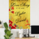 Design simples e moderno, com um lindo design floral cor de laranja e vermelho em fundo dourado. Todas as informações são facilmente alteradas para que seu casamento seja bem-vindo. Parte de uma suíte de papéis de carta de Casamento dos Designs Finos de Chessie.