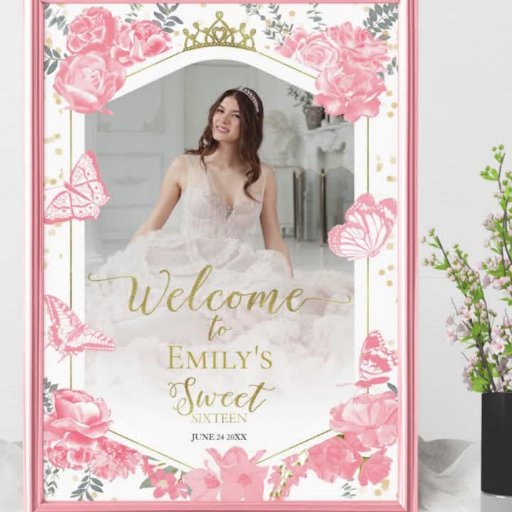 Celebre seu Sweet 16 da forma mais encantadora! Nosso sinal de boas-vindas floral cor-de-rosa-d'água, enfeitado com borboletas delicadas, define o tom para uma celebração caprichosa. Completem-nos com o nosso espetacular confete para um pop alegre! Transforme seu partido em um florescimento eufórico e crie memórias tão coloridas quanto nosso sinal de boas-vindas.