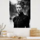 Fotografia em preto e branco simulando uma foto viscosa angustiada de um professor do século XIX vestindo um vestido preto com botões prateados. Feito com algoritmos generativos e Photoshop.