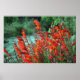 Uma foto das flores gladióbulas é manchada pela cor. Flores de laranja-vermelha com sotaques amarelos cobrir o caule das plantas. A profundidade superficial do campo dá ao fundo verde uma aparência parecida. 35 mm, cor.