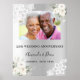 Celebrando um aniversário de casamento de 25 prata. Um fundo com aspecto fino prateado, decorado com flores brancas e rendas. Personalize e adicione sua própria foto de alta qualidade do casal feliz. O texto: Os nomes são escritos com um estilo preto moderno, escrito à mão. Tempates para os nomes e uma data.