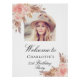 Um poster de boas-vindas para uma festa de aniversário elegante e moderna. Fundo branco, decorado com grama pampas estilo "boho" e ouro rosa e flores cor-de-rosa pinceladas. Personalize e adicione uma dentro de foto ao quadro, nome e idade do arco.