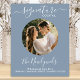 Bebidas Especiais ! Caligrafia simples e elegante, este letreiro de bar de bebida especial apresenta um coquetel 'os Recém-Casados', personalizado com sua bebida de escolha. Personalize este letreiro de casamento elegante com sua foto de noivado favorita ou foto de casal, nome e bebida especial! Você também pode personalizar as fotos das bebidas especiais com as fotos de seus animais de estimação favoritos para um casamento de animais! Personalize com fotos de cães ou gatos. DIREITOS AUTORAIS © 2020 Judy Burrows, Black Dog Art - Todos os Direitos Reservados. Foto de Coquetel Especial Cartaz de Casamento Azul Empoeirado para Bar