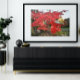 Impressão de poster brilhante estilo, com uma imagem fotográfica colorida de folhas brilhantes, vermelhas e um santuário vermelho e miniatura num jardim japonês. Personalize o tamanho do impressão do poster, conforme desejado. Foto: Point Defiance Park Jardim Japonês