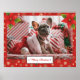Design de Férias de Natal bonitas com flores de poinsettia nas bordas superiores e um fundo vermelho de Natal com flocos de neve gentis e uma Placa de Natal Feliz. Natal elegante com foto editável de um filhote fofo. Personalize alterando a foto.