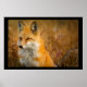 Uma poster com uma bela fotografia de uma raposa vermelha no outono. Ficando na natureza entre a escova.