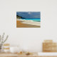 Poster com uma bela fotografia com um mar azul de turquesa e uma praia arenosa com ondas de surf de espuma.