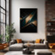 Linhas nítidas e contrastes metálicos se intersetam numa peça de luz e sombra, criando uma composição elegante e sofisticada. O trabalho de arte transmite modernidade e poder, evocando a essência do eterno e impondo o design.