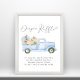 Um cartaz de queda de rifa de fralda para o chá do seu bebê que apresenta "rifa de fralda" em um roteiro chic com uma haste cardíaca e aquarelas de um caminhão de colheita azul carregado com abóboras e flores. Personalize facilmente as instruções de fralda na tipografia simples das cinzas.
