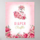 Este é o cartaz da Fralda para o chá de fraldas. O design é um flamingo cor-de-rosa querido, bailarina, mãe e menina, com rosa rosa rosa rosa, flores florais na cabeça e um buquê de rosa maior ao lado dos corpos. Fundo cor-de-rosa macio com triângulos de ouro bonitos. Centro branco com flores rosas cor-de-rosa na borda inferior.