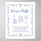 Um cartaz de queda de rifa de fralda para o chá do seu bebê que apresenta um quadro de onda azul francês adornado com arcos, ilustrações brancas e caprichosas desenhadas à mão de corações, estrelas, decoração de bolo e berçário, e "Raffle Fralda" mostrada em um roteiro azul divertido.
