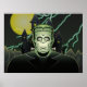 Faça seu quarto ou sala de estar manchado com esta poster de Halloween incrível apresentando o Monstro Frankenstein contra um castelo escuro, lua de cheio e relâmpago verde do artista digital Chris Shepard!