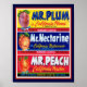 poster colorido com qualidade de excelente com 3 anúncios para Frutas da Califórnia. Sr. Plum, Sr. Nectarine e Sr. Peach. Este poster apresenta caricaturas de fruta felizes da década de 1950 em planos de fundo coloridos.
