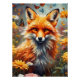 Ein hübscher kleiner Fuchs schaut dich an. Er sitzt zwischen Blumen und spielte mit Schmetterlingen.