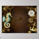 Fundo de madeira castanho com fundo marinho, cordilheira mecânica, volante antigo, âncora de ouro e diversas engrenagens de ouro e latão. Estilo Steampunk.