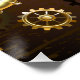 Fundo de madeira castanho com fundo marinho, cordilheira mecânica, volante antigo, âncora de ouro e diversas engrenagens de ouro e latão. Estilo Steampunk.
