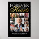 Elegante poster do memorial funerário com 15 fotos do seu ente querido perdido, o texto "para sempre em nossos corações", o nome e as datas de nascimento/morte.