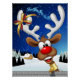 A Funny cartoon reindeer with a bright red nose and large white antlers, adorned with a red and gold bow, peeks through an open window. Outside, a snowy landscape with silhouetted pine trees and a small, glowing house is visible under a dark blue, star-filled night sky. Santa's sleigh pulled by reindeer is flying in the distance. The scene evokes a festive and whimsical Christmas atmosphere. Original Vector Art Copyright BluedarkArt TheChameleonArt.