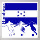 Três jogadores de futebol jogam em frente à bandeira hondurenha. Nome do país Honduras está do lado