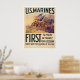 Da vasta coleção de Administrações de Projetos de Trabalho (WPA) e cartazes de Guerra da Zazzle—uma incrível variedade de imagens icônicas desenhadas para promover as artes, o bem-estar público e o patriotismo—Esta impressão de poster comemorativa apresenta um poster de recrutamento de fuzileiros dos Estados Unidos mostrando um grupo de fuzileiros correndo para o carregando de batalha da bandeira americana e da bandeira do Corpo Marinho. Publicado entre 1914 e 1918.