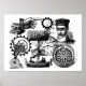 Steampunk inspirou design gráfico preto e branco. Apresenta muitos itens embandeados da idade vitoriana de um balão engatado a vapor, passeio de bicicleta, homem entupido, bússola, cara de relógio ou relógio, mão, máquina de escrever, lâmpada e engrenagens. Excelente para qualquer um que goste de vapor, design, engenharia ou mecânica.