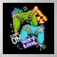 A dynamic gaming-themed illustration featuring two colorful game controllers with bold graffiti-style text reading “Born to Play,” “Game On,” and “Next Level” on a black background.
