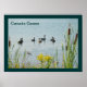 Uma pintura digital de gansos canadenses (Branta canadensis) nadando com cattails (Typha latifolia) e outra vegetação em primeiro plano. O texto "Canada Goose" também é exibido.