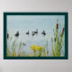 Uma pintura digital de gansos canadenses (Branta canadensis) nadando com cattails (Typha latifolia) e outra vegetação em primeiro plano.