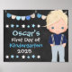 Procurando um detalhe extra fofo para a foto do primeiro dia de aula deste ano? Este letreiro de garotinho moderno é tão fofo e colorido. Ele apresenta um garotinho adorável usando suspensórios com estrelas e bandeirolas em cores coordenadas de azul, cinza e branco. Pode ser personalizado para qualquer nome e série.