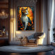 Este trabalho de arte mesmerizante ao estilo de vidro manchado captura a elegância de um gato assando em um brilho quente do outono. Padrões geométricos ricos e uma paleta vibrante de laranja, ouro e azul escuro criam uma peça decorativa de eterno. Perfeito para amantes de os animais e fãs de arte moderna e sofisticada.
