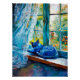 Um gato preto azul dorme em uma borda de janela em um cenário tranquilo e iluminado pelo sol. Pintura